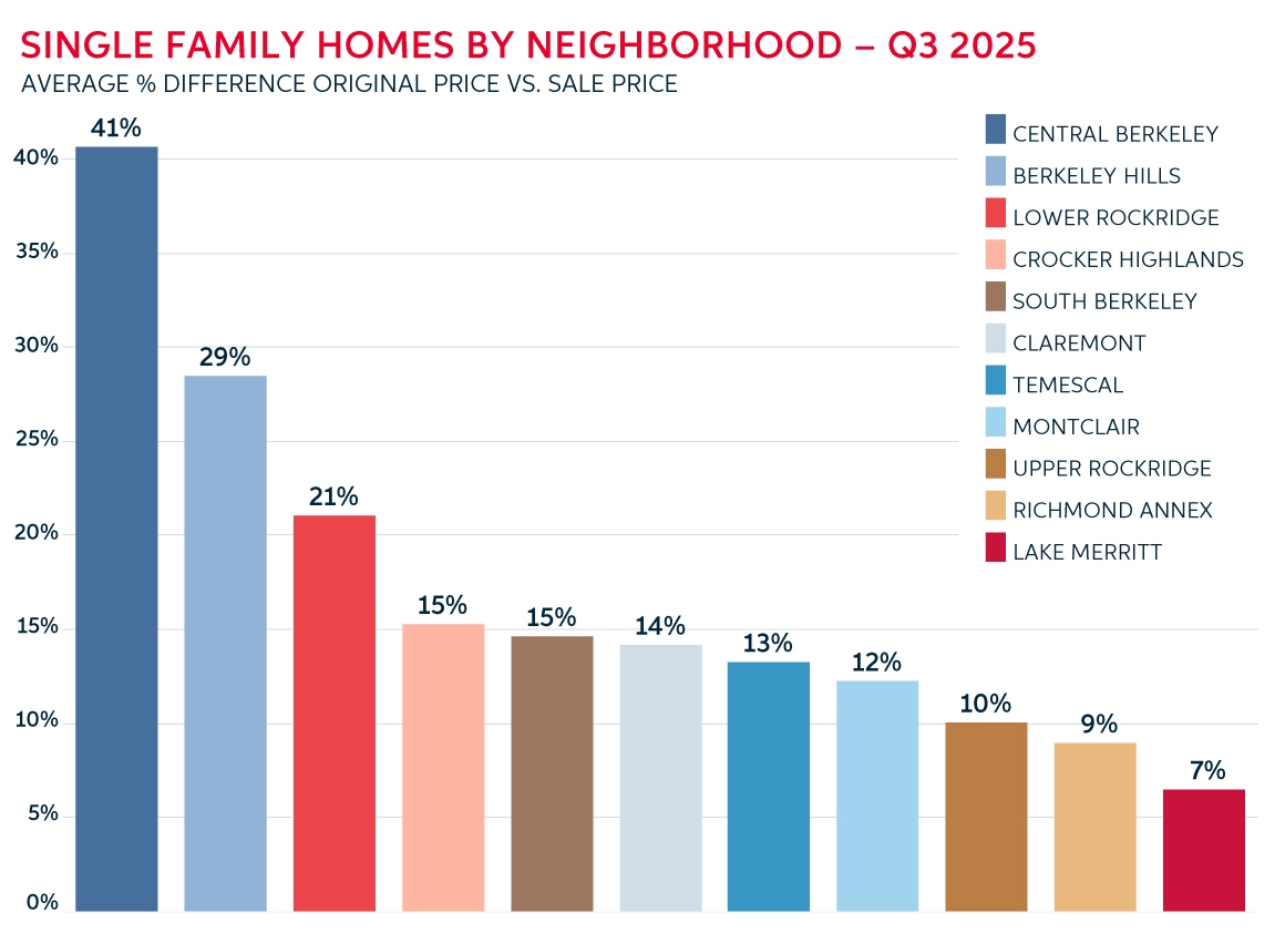 The Inner East Bay real estate market in Q3 2025 marked a clear shift from the previous year, as rising inventory and tempered price growth gave buyers more leverage in certain neighborhoods and created a healthier balance between supply and demand. After several years of volatility and pricing climbs, prices stabilized – with the median single-family home price down 3.2% year-over-year – reflecting a continued correction from pandemic highs. Higher mortgage rates, hovering near 6.9%, led to more measured buyer activity and longer days on market, softening competition and prompting more strategic pricing among sellers. Still, with median home prices around $1 million – well below those in San Francisco, Marin, and the Peninsula – the Inner East Bay remained one of the Bay Area’s strongest values and most resilient housing markets.