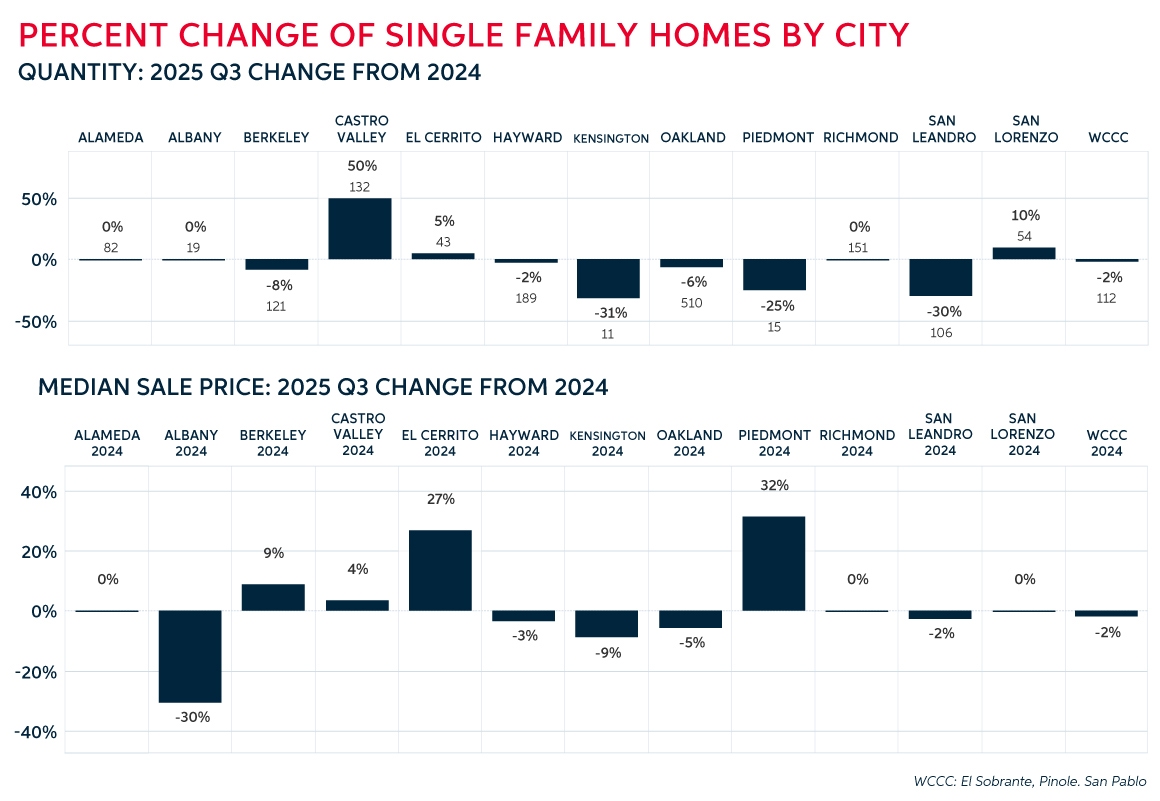 Castro Valley saw renewed energy in Q3, with a median sale price near $1.2 million (up 4% YOY) and a 50% increase in single-family home sales year-over-year, reaching 132 total transactions.